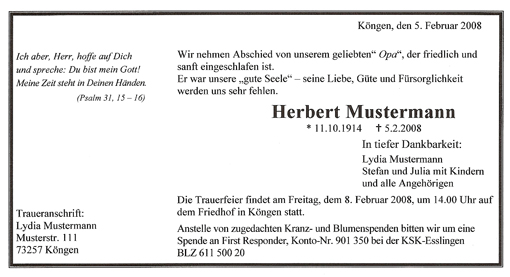 Wer Verwandten, Freunden und Bekannten den Tod eines nahen Angehörigen mitteilen will, erreicht dies am besten durch eine Anzeige in der Regionalen Tageszeitung. In Köngen ist dies die Esslinger Zeitung.